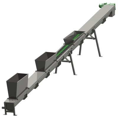 A szállítandó darabos szilárd közeg tengely nélküli spirál segítségével kerül továbbításra. A spirálcsiga hajtómotorral ellátott.
